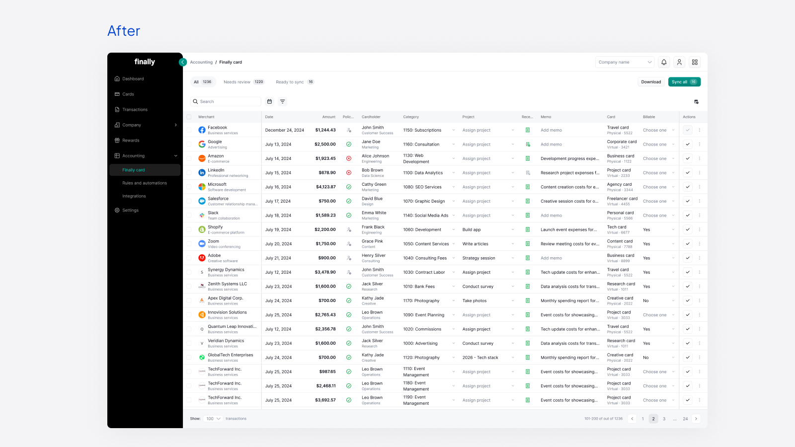 After observing real workflows, the redesign addressed each failure point directly. The table became fully customizable, users control which columns are visible, resize and pin what matters, and work with a default row count that matches actual usage patterns. Fixed columns eliminated horizontal drift on wide datasets. Navigation was restructured around how accountants actually move through the product, and the layout was adapted for mobile without sacrificing the density that power users depend on.